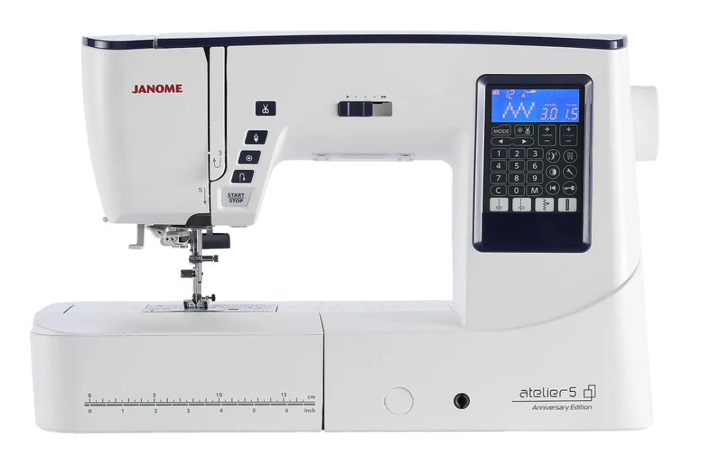 The Janome Atelier 5 10-Year Anniversary Edition celebrates a decade of excellence and innovation in sewing, quilting, and crafting. This special edition model builds on the robust features of the original Atelier 5, adding exclusive enhancements and stylish commemorative details to honor this milestone. It is designed for sewists who demand precision, versatility, and aesthetics.
